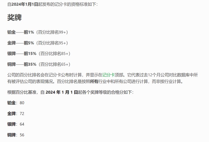 从2024年起,奖牌将根据百分位数阈值颁发,而不是以前使用的每个奖牌级别的分数范围。企业的百分位排名在记分卡发布时计算,并出现在在线记分卡的顶部。百分位数将一家公司在过去12个月里的表现与数据库中所有被评级公司的表现进行比较。