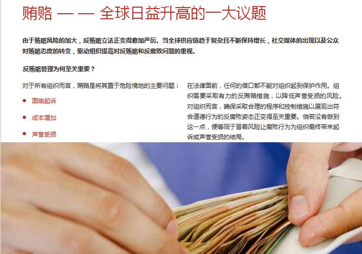 2016年10月15日,为有效管控贿赂,国际标准化组织发布 ISO 37001《反贿赂管理体系要求及使用指南》。
