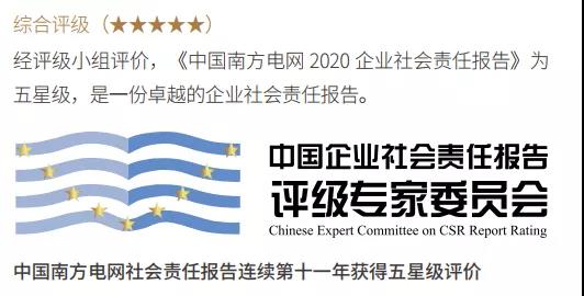 《报告》再次获得“中国企业社会责任报告评级专家委员会”的五星级评价,是南方电网公司连续第十一年获得五星级评价,被认定为一份卓越的企业社会责任报告。