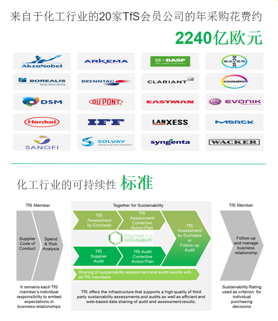 (Together for Sustainability-Chemical Initiative 简称 TfS-CI)“携手实现可持续发展”-化*盟,其成员企业包括巴斯夫,拜耳,赢创工业,汉高,朗盛和苏威。成员企业在与共同分享可持续发展评估,审核和能力建设举措,这有助于减少重复性和释放资源,以做出更有效的改进,为此,各成员企业以联合国全球契约,责任关怀宪章和国际劳工组织公约这类参考框架做为依据,共同制定了TfS对供应商可持续发展要求。