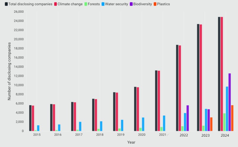 截至2024年,全球参与CDP披露环境数据及评级的企业数量再创新高,已达24863家。
