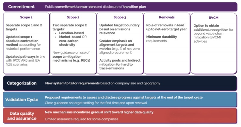 下图呈现了草案关键提议变化的概要。在承诺方面,要求公开趋近净零承诺及披露转型计划;范围设定上,各范围目标设定均有更新,如范围3强调相关排放源及非排放指标;企业分类采用基于规模和地域的新体系;验证周期新增目标周期末评估与披露进展要求;数据质量与保证方面,新机制激励提升数据质量,部分企业需有限保证。